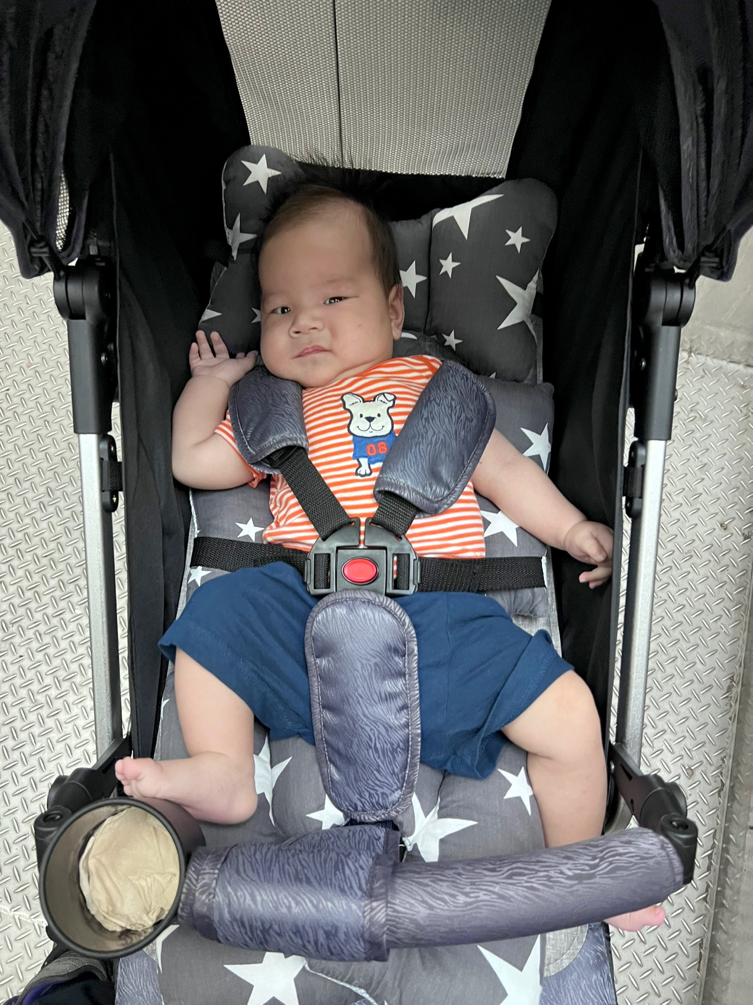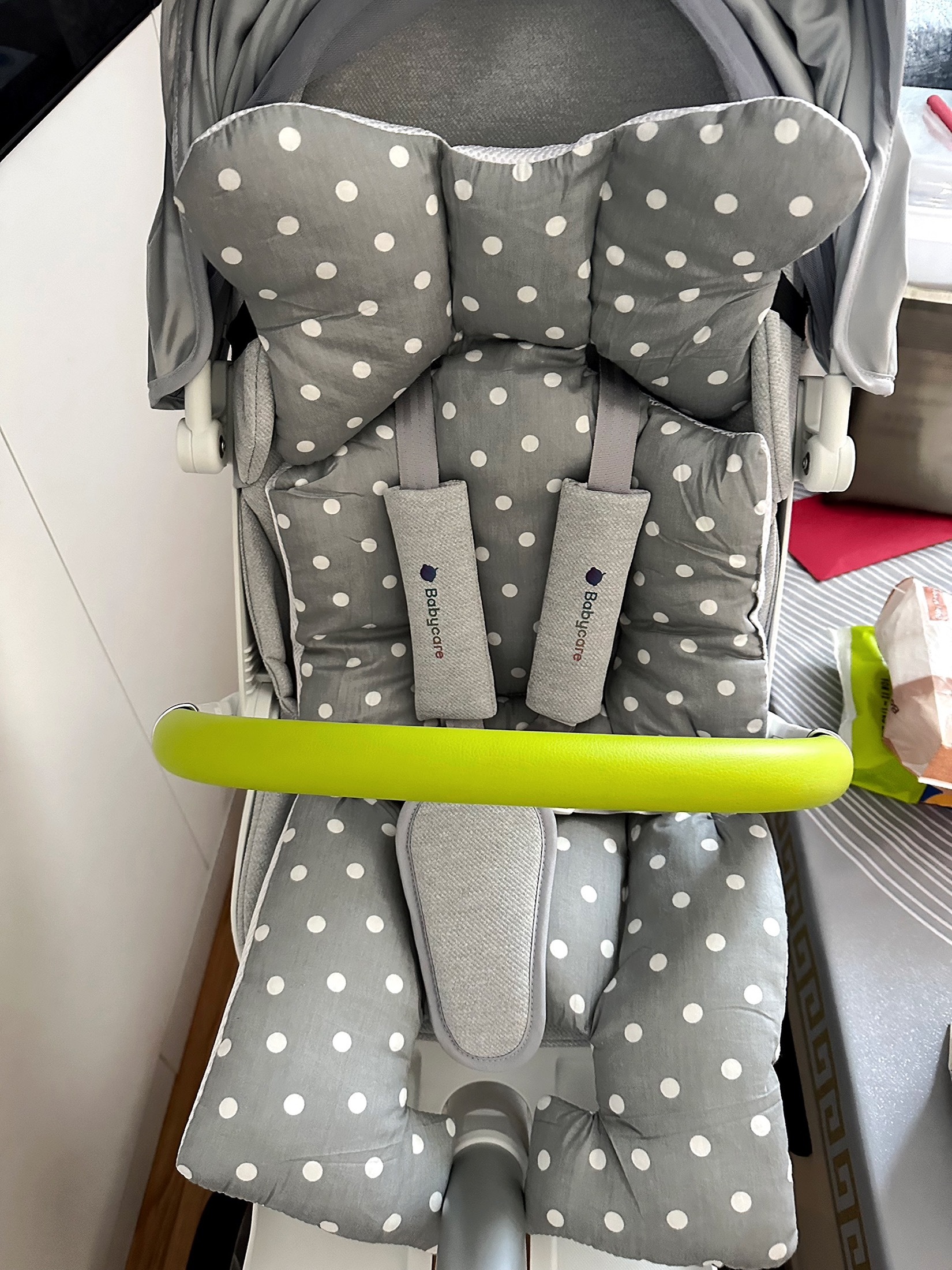 This is a reversible stroller cushion, the front side is made of high-weight cotton fabric, the back side is a breathable mesh layer, filled with a mixture of padding, which